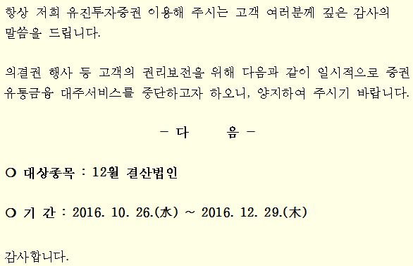 공지사항 대주서비스 일시 중단 안내 2016/10/18 영업추진팀 조회 250 목록보기 이전글 [수시공시] 동부해오름인덱스알파증권투자회사[주식-파생형]약관,투자설명서, 간이투자설명서 변경 다음글 [수시공시] 동부다같이법인MMF 제2호 약관,투자설명서, 간이투자설명서 변경