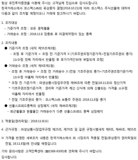 공지사항 코스맥스(주) 유상증자에 따른 주식선물 시장조치 예정 안내 2016/11/02 e-biz팀 조회 135 목록보기 이전글 [소규모펀드공시]당사판매 2016.10월 수시공시 대상 소규모 펀드리스트 다음글 페이퍼코리아(주) 실권주 일반공모 청약 안내 [11/2(수)~3(목)]