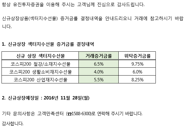 공지사항 신규상장상품(섹터지수선물) 증거금률 결정내역 안내 2016/11/11 e-biz팀 조회 185 목록보기 이전글 [수시공시] 삼성클래식중소형연금증권자투자신탁 제1호[주식]투자설명서, 간이투자설명서 변경 다음글 신용융자 및 담보대출 대상종목 정기변경 안내