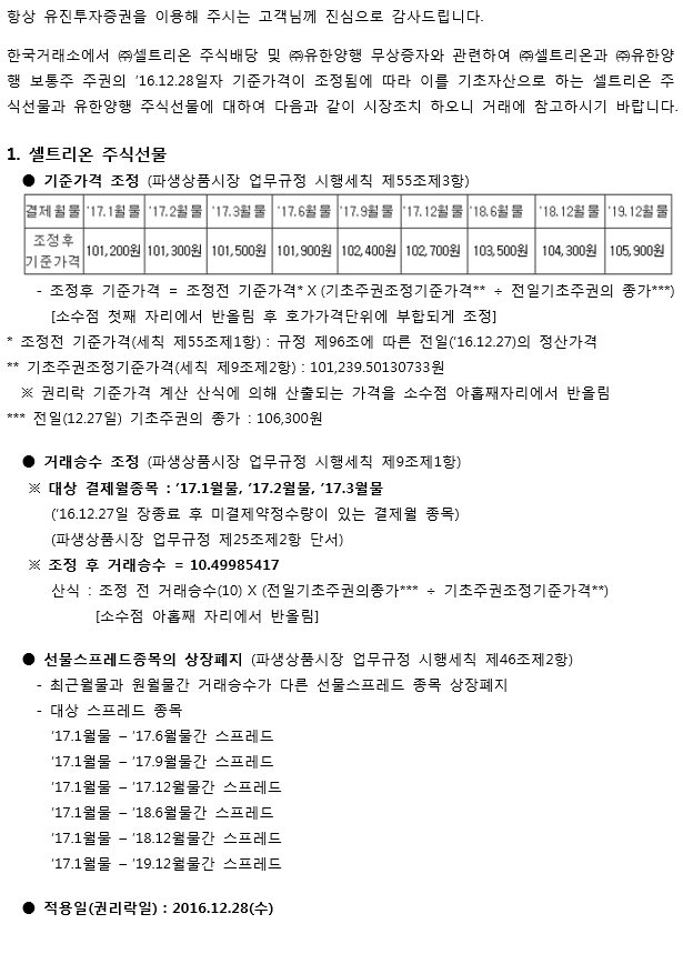 공지사항 (주)셀트리온 주식배당 및 (주)유한양행 무상증자에 따른 주식선물 시장조치 안내 2016/12/29 e-biz팀 조회 284 목록보기 이전글 국내MTS 선물옵션 대용증권 지정/해지 신규화면 반영안내 다음글 금융결제원 금융공동망 일시중단 안내