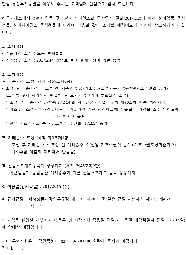 공지사항 (주)한미약품 및 (주)한미사이언스 무상증자에 따른 주식선물 시장조치 예정 안내 2017/01/06 e-biz팀 조회 187 목록보기 이전글 [수시공시] 메리츠코리아스몰캡증권신탁[주식]투자설명서, 간이투자설명서 변경 다음글 [2112]자사주매매정보 화면 체결상세정보 연속조회 기능 제공