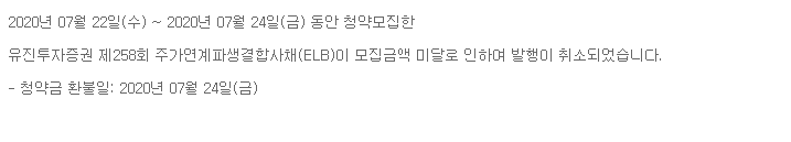 공지사항 [발행취소 안내] 제258회 주가연계파생결합사채(ELB) 2020/07/24 장외파생상품팀 조회 444 목록보기 이전글 [일정 안내] 유진투자증권 제359회 주가연계파생결합증권(ELS) 다음글 [배정 및 기준지수 확정 안내] 제358회 주가연계파생결합증권(ELS)