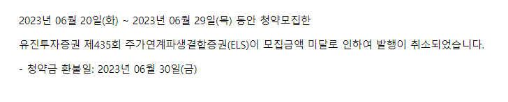 공지사항 [발행취소 안내] 제435회 주가연계파생결합증권(ELS) 2023/06/30 FICC팀 조회 197 목록보기 이전글 [만기상환 안내] 제360회 주가연계파생결합사채(ELB) 다음글 [종목쏙쏙] 로보스탁, 초이스스탁US, AI PICK3 종료 안내
