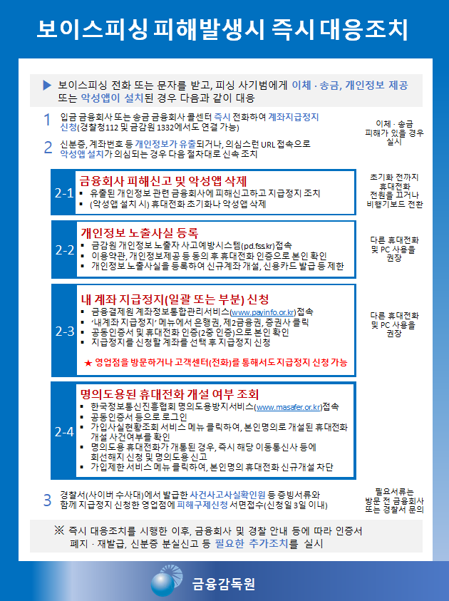 공지사항 보이스피싱 피해발생시 대응요령 및 설명자료 2023/08/17 업무개발팀 조회 3065 목록보기 이전글 보이스피싱 특별 자수기간 안내 다음글 [만기상환 안내] 제379회 주가연계파생결합사채(ELB)