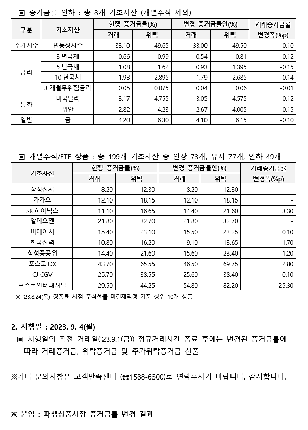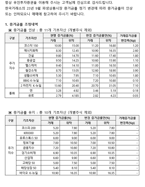 공지사항 2023년 9월 파생상품시장 증거금률 정기변경 결과 안내 2023/08/31 업무개발팀 조회 274 목록보기 이전글 (오픈뱅킹) 일부 제공기관 서비스 일시중단 안내 다음글 [배정 및 기준지수 확정 안내] 제448회 주가연계파생결합증권(ELS)