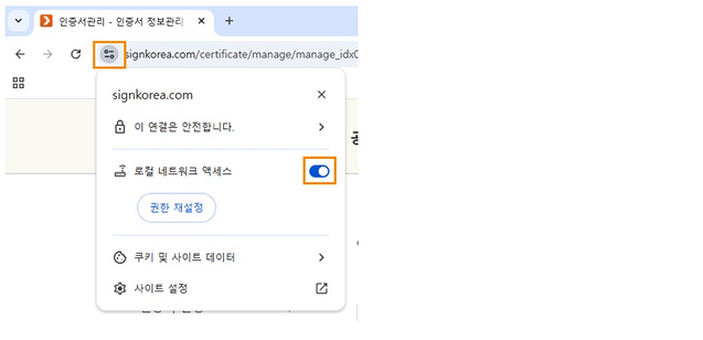 만약에 차단을 누른 경우 주소창 옆 [사이트 정보 보기] 버튼 클릭 후 [로컬네트워크 엑세스] 허용 설정이 필요합니다.