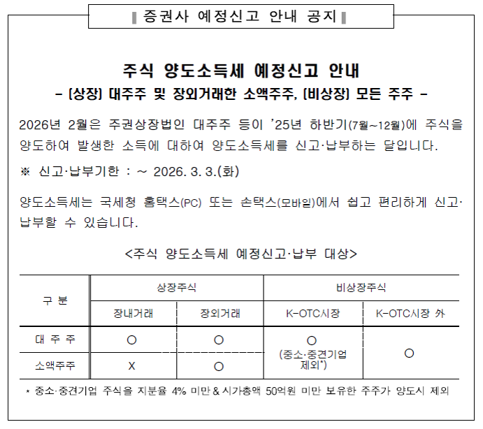 2025년 하반기 주식 양도소득세 예정신고에 대해 아래와 같이 안내하오니 기한 내에 신고 및 납부하시길 바랍니다.